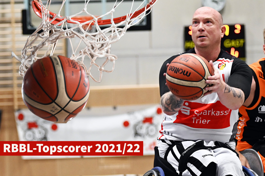 Dirk Passiwan ist auch in der Saison 2021/22 Topscorer der 1. Rollstuhlbasketball Bundesliga. Bereits zum 22. Mal in seiner Karriere konnte er sich den Ehrentitel des Scharfschützen der Liga sichern. Mit überragenden Leistungen und einem Offensivspiel, das in vielen Fällen einfach nicht zu verteidigen ist, stellte der Trierer ein weiters Mal unter Beweis, dass er auch mit 45 Jahren noch einer der besten Rollstuhlbasketballer der Welt ist. In 15 Hauptrundenspielen und damit eines weniger, als seine Konkurrenten, erzielte er 474 Punkte, im Schnitt 31,6 Punkte pro Spiel. Auf den Plätzen zwei und drei folgen Mojtaba Kamali (BG Baskets Hamburg, 16 Spiele/433 Punkte/27,1 pro Spiel) und Aliaksandr Halouski (15/360/22,5). Den Punkterekord der aktuellen Saison erreichte Dirk Passiwan im Heimspiel gegen die ING Skywheelers aus Frankfurt, als ihm 55 Punkte gelangen.