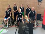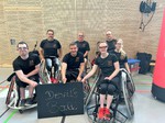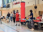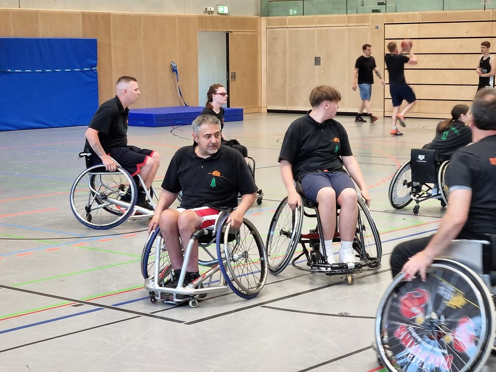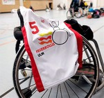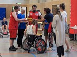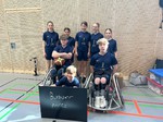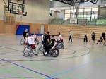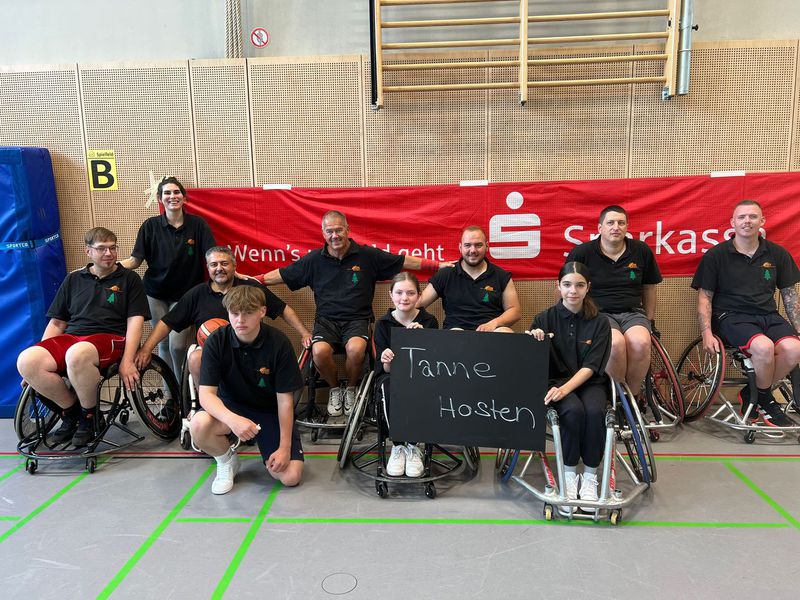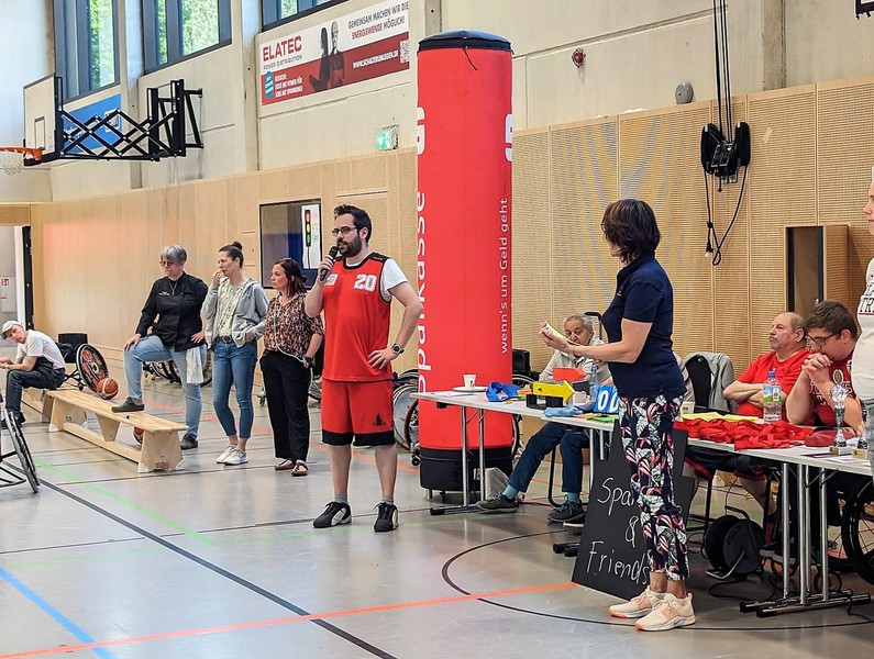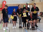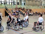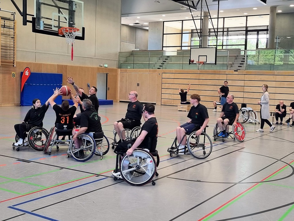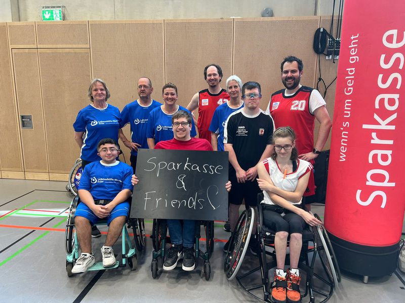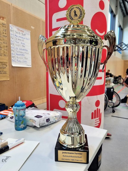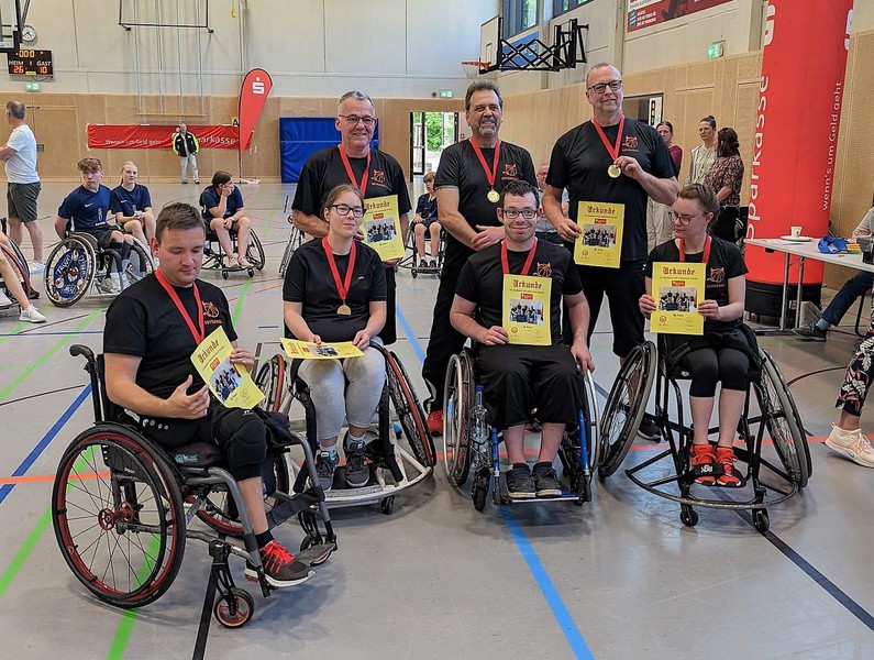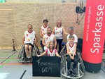 Was haben ein Karnevalsverein, Basketballer vom TVG Trier, Mitarbeiter der Sparkasse Trier, die Lebenshilfe Trier, eine Familie aus Ulm, eine Gruppe Jugendlicher aus der Umgebung und einige Hobby- und Jugendspieler der Dolphins gemeinsam? Sie alle, unterstützt durch mehrere Einzelspieler, traten am letzten Samstag beim 12. Sparkasse Trier-Jedermannturnier an, um gemeinsam Rollstuhlbasketball zu spielen. Noch mehr als bei den Ligaspielen zeigt sich bei diesen Turnieren der inklusive Charakter des Rollstuhlbasketball. Obwohl die zehn Teams nicht bunter hätten zusammengewürfelt sein können, kamen spannende Spiele zu Stande in denen jede Mannschaft ihre individuellen Stärken ausspielen konnte. Bei einigen stand das Können am Ball im Vordergrund, andere hatten mehr Erfahrung im Umgang mit den Sportrollstühlen und wieder andere überzeugten durch Leidenschaft und Teamgeist. Von Anfang an war wieder die besondere Jedermannturnier-Stimmung zu spüren, bei der trotz allem Ehrgeiz viel gelacht wurde. Fast alle Teams hatten sich Team-Shirts machen lassen, zwischen den Teams gab es viele Späße, andere Teams wurden angefeuert und die Damen des Karnevalsvereins Welschbillig sorgten mit ihren High Heels bereits beim Teamfoto für gute Stimmung.