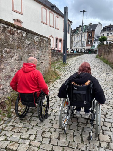 Kleingruppen in der Trierer Innenstadt unterwegs. Dabei konnten die Teilnehmenden erleben, wie unterschiedlich zugänglich unsere Stadt für Rollstuhlfahrer ist. Vom Überqueren verschiedener